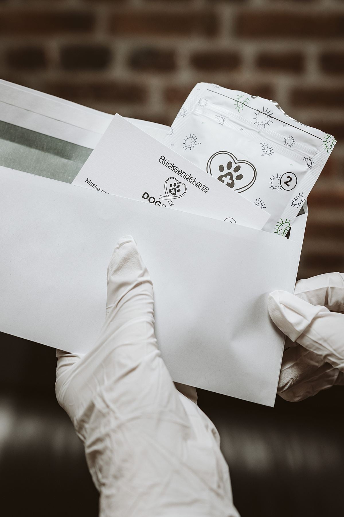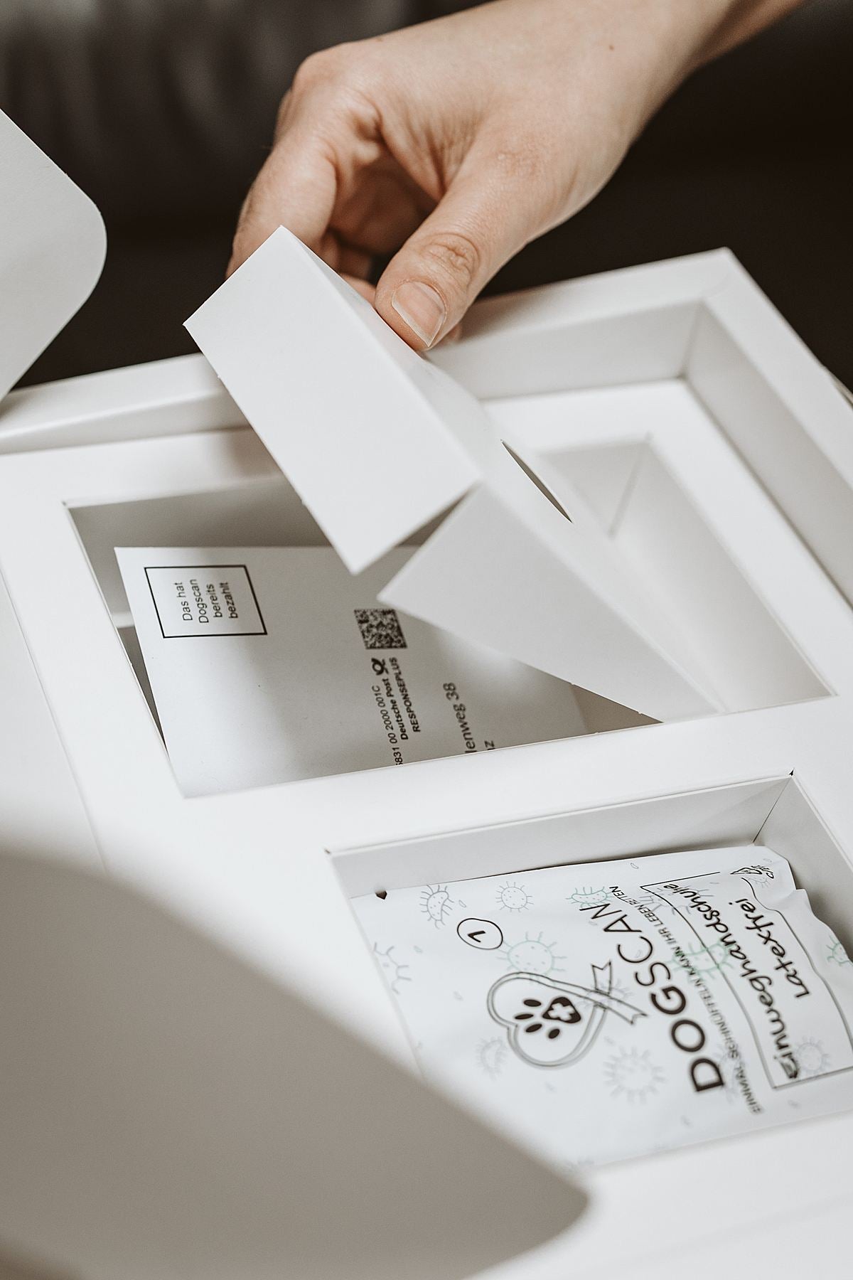 Achten Sie unbedingt auf den Rücksendeumschlag! Dieser befindet sich im Fach unter der Spezialmaske!